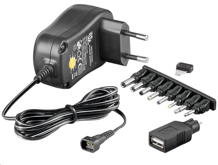 Univerzálny napájací adaptér 230V/3-12V stejnosmerný 300mA - 3V-12V po krokoch, rovnomerných DC - možnosti nastavenia na: 3.0-4.5-5.0-6.0-7.5-9.0-12.0 V DC výstupné napätie - maximálny prúd 300mA - USB napájací konektor - vyhovuje normám EuP directive 2005/32/EG - Rozmery: 69 x 39 x 31 mm - Vstupné napätie: AC 100-240V ~ 60/50Hz - LED dióda signalizujúca zapnutie - dĺžka prívodného kábla 180 cm Adaptér vyhovuje požiadavkám medzinárodných štandardov ECO-design, CEC a MEPS. Tieto štandardy zaručujú nízku spotrebu pri "stand-by-mode" bez záťaže a zníženie CO2 emisií. V porovnaní s bežnými adaptéry dokáže ušetriť až 30% elektrickej energie. 9ks rôznych výmenných koncoviek v sade (pri výbere konektora nutné zvoliť správny konektor, ktorý pasuje a má kontakt) - USB outlet - 2.5 mm plug - 3.5 mm plug - 3.5 x 1.35 mm DC plug - 5.0 x 2.1 mm DC plug - 5.5 x 1.5 mm DC plug - 5.5 x 2.5 mm DC plug - NEW 5.5 x 2.1 mm DC plug - NEW 4.0 x 1.7 mm DC plug.