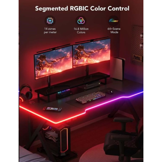 Vylepšite svoje herné, filmové a hudobné zážitky s dizajnovým tvarovateľným svetelným pásom na písací stôl - Govee Neon Gaming Table Light. Je energeticky úsporný s životnosťou až 50.000 hodín. Vďaka technológii RGBIC zobrazuje tento neonový svetelný pás až 57 farieb naraz a celkovo vie zobraziť až 16 miliónov farieb s intenzitou v rozmedzí 1-100%. Určite si vyberiete z viac ako 64 režimov osvetlenia a pri pozeraní obľúbenej hudby si môžete zvoliť tiež z 11 rytmických režimov. Svetlá sa ovládajú hlasom cez Siri, Amazon Alexa alebo Google Assistant alebo cez aplikáciu Govee Home na vašom smartfóne/tablete. Svetelný pás má celkovú dĺžku 3 metre, je určený na inštaláciu na rôzne typy stolov a jeho tvar si môžete upraviť podľa vlastnej fantázie. Inštalácia je veľmi jednoduchá bez vrtania pomocou 3M pásky.