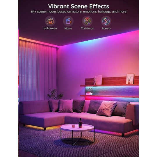 Úsporné interiérové chytré LED pásiky Govee WiFi RGBIC PRO SMART 5m s životnosťou až 50.000 hodín spravia z vášho domu designový skvost. Môžete ich použiť takmer všade - obývačka, spálňa, kuchyňa, pracovňa atď. Zobrazuje až 16 miliónov farieb, ktorých intenzitu môžete nastaviť od 1-100 % a vďaka technológii RGBIC si môžete rozdeliť pásik na samostatné segmenty, pre ktoré si potom môžete voliť rozdielne farby. Vyberte si zo 64 režimov osvetlenia a pri počúvaní obľúbenej hudby sa budú svetlá synchronizovať vďaka vstavanému mikrofónu a vytvoria nezabudnuteľný zážitok. Alebo si jednoducho nastavte vlastné farebné kombinácie v režime DIY. Príkazy môžete zadávať aj hlasovo cez Siri, Amazon Alexa alebo Google Assistant, cez aplikáciu Govee Home na smartfóne alebo tablete alebo cez Control box. Svetlo má dĺžku 5 metrov a jeho inštalácia je veľmi jednoduchá. Pomocou časovača môžete svetlá zapínať a vypínať automaticky podľa západu a východu slnka, alebo zaspávania a ranného vstávania.