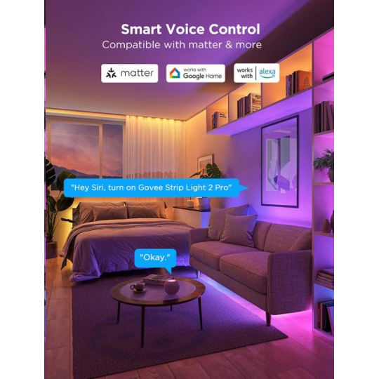 Govee LED Strip Light 2 Pro je vybavený in-house vyvinutým riadiacim čipom G1151, ktorý zabezpečuje bezproblémovú a rýchlu kontrolu svetelných efektov. Diody RGBWWIC 5v1 poskytujú dokonalú reprodukciu farieb a ideálne podanie bielej od teplej po studenú, hustota je 60 LED na 1 meter. Pásek podporuje protokol Matter, čo umožňuje bezproblémovú kompatibilitu s väčšinou Smart Home systémov s chytrými asistentmi ako Google Assistant, Siri a Alexa, takže ju môžete ľahko integrovať do svojej chytrej domácnosti. Vďaka aplikácii Govee Home získate plnú kontrolu nad farbami, jasom a segmentmi LED pásika, pričom je možné rozdeliť pásik až na 6 segmentov na meter pre dokonalé farebné gradienty a personalizáciu.
