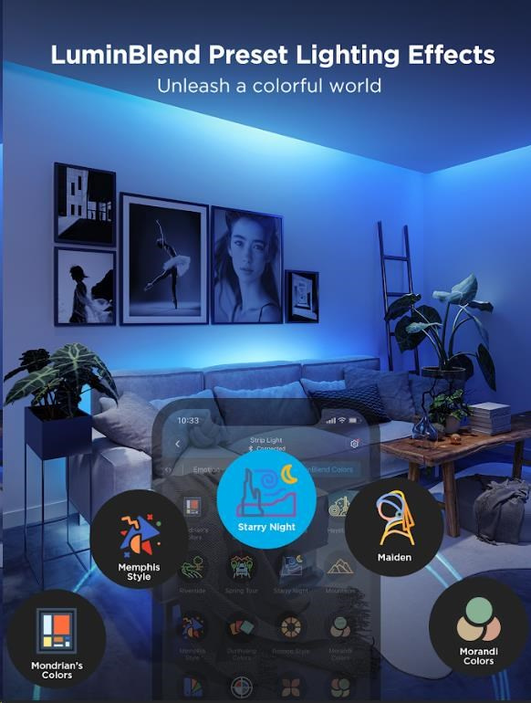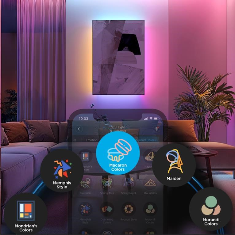 Pokročilý DIY režim LED Strip Light 2 Pro umožňuje vytvárať vlastné svetelné efekty, zatiaľ čo desiatky prednastavených scén vám poskytujú okamžitú inšpiráciu pre rôzne príležitosti – od relaxačného večera po energickú párty. Každá scéna je navrhnutá tak, aby maximálne využila možnosti plynulých prechodov farieb a dynamických efektov. So 16 miliónmi farieb si môžete hrať s nekonečnými kombináciami, ktoré sa dokonale prispôsobia akejkoľvek atmosfére. Synchronizácia s hudbou navyše zabezpečuje, že svetlá oživí každý rytmus a zvýši zážitok z počúvania.