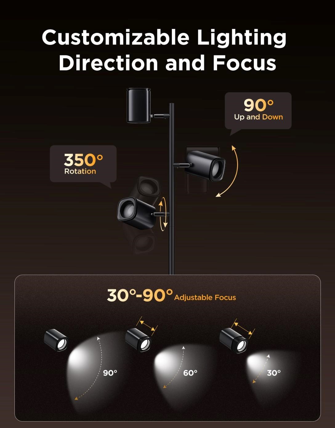 Každé rameno lampy je plne nastaviteľné, čo vám umožní nájsť dokonalý uhol a smer svetla. Ramena sa otáčajú o 350° horizontálne a 90° vertikálne, zatiaľ čo hlavica ponúka jemnú rotáciu 30°–90°. Tým dosiahnete presné nasvietenie priestoru podľa vašich potrieb. Flexibilné ovládanie každého zdroja samostatne vám dáva kontrolu nad jasom, farbou aj zapnutím. Vďaka tejto variabilite je lampa skvelá na čítanie, ako aj na zvýraznenie dizajnových prvkov v interiéri.