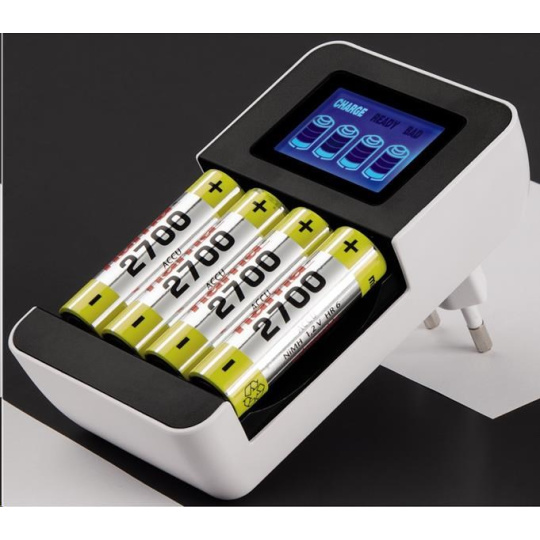 - zásuvková nabíjačka pre 1-4 NiMH akumulátory AA (mignon) alebo AAA (micro) - 4 individuálne nabíjacie sloty, každý akumulátor je monitorovaný a nabíjaný samostatne (možnosť nabíjania akumulátorov rôzneho typu a kapacity súčasne) - LCD displej s grafickým zobrazením priebehu nabíjania - nabíjanie riadené mikroprocesorom (ochrana proti prebitiu a prehriatiu akumulátorov) - automatické ukončenie nabíjania pomocou detekcie Delta-U - bezpečnostná časová poistka - detekcia vadných akumulátorov - ochrana proti nesprávnej polarite Technické parametre: - typ nabíjačky: automatická - konštrukcia nabíjačky: zásuvková (integrovaná sieťová vidlica) - typ akumulátorov: NiMH, veľkosť AA (R6) mignon/AAA (R03) micro - nabíjací prúd: 450 mA (AA)/200 mA (AAA) - napájanie: 100-240 V/50 Hz - farba: čierna/biela