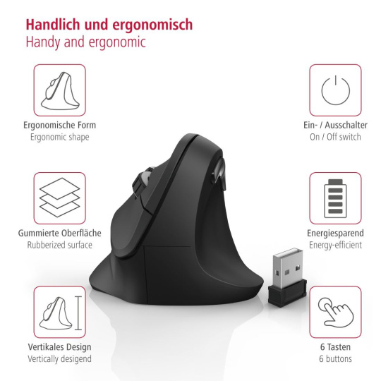 Vertikálna ergonomická bezdrôtová myš Hama EMW-500, 6 tlačidiel, čierna