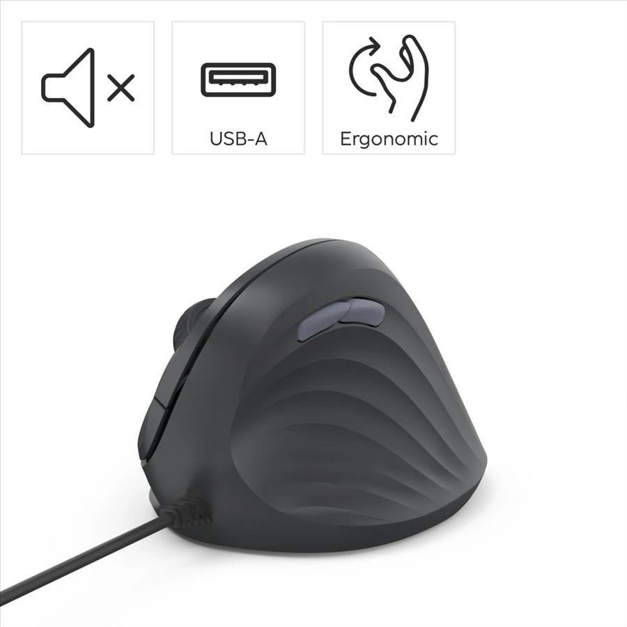 - moderná ergonomická káblová myš pre prácu s počítačom bez bolesti - vertikálne prevedenie predchádza presileniu a bolesti ramien a zápästí - tichá, bez zvukov pri klikaní pre nerušenú prácu - DPI tlačidlo pre zmenu rozlíšenia (1000/1400/1800 DPI) - aktivácia AI asistenta v systéme tlačidlom - tlačidlá s funkciou späť/vpred v prehliadači - pogumovaný povrch myši a kolieska - polymerové kĺzne plochy - dlhý kábel s pripojením k USB-A alebo USB-C zásuvke (integrovaný adaptér) - telo a tlačidlá sú vyrobené z 65% recyklovaného ABS plastu - balenie je 100% bez plastov Systémové požiadavky: - bežné funkcie: Windows 11/10, Mac OS 11 alebo novšie - tlačidlo Assist: Windows 11 s aplikáciou Microsoft Copilot Technické parametre: - pripojenie: USB-A vidlica, USB-C vidlica - počet tlačidiel: 7 vrátane rolovacieho kolieska - rozlíšenie: 1000/1400/1800 DPI - dĺžka kábla: 1,8 m - rozmery: 8,6 x 11,5 x 7,1 cm - hmotnosť: 110 g - farba: čierna.