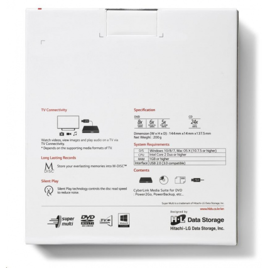 HITACHI LG - externá mechanika DVD-W/CD-RW/DVD±R/±RW/RAM GP60NW60, Slim, biela, krabica+SW