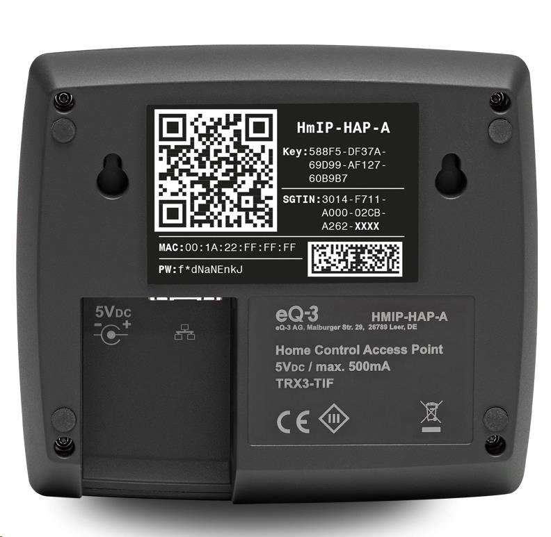 Centrálnu jednotku (HmIP-HAP-A) je pripojená k štandardnému routeru ethernetovým káblom (RJ-45) a slúži ako rozhranie medzi cloudom Homematic IP umiestneným výlučne na serveroch v Nemecku a zariadeniami Homematic IP vo vašej domácnosti.