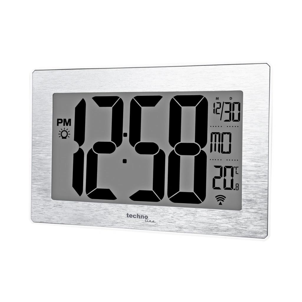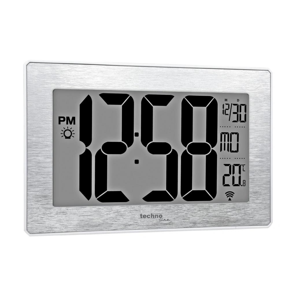 Digitálne nástenné hodiny s LCD displejom, nočným podsvietením, časom riadeným rádiovým signálom DCF-77 a meraním vnútornej teploty • nástenné hodiny s možnosťou postavenia • veľkosť inverzného displeja 168 x 95 mm • možnosť nastavenia intervalu nočného podsvietenia displeja oranžovým svetlom, dva stupne jasu • veľkosť číslic - čas 87 mm, dátum 15 mm (mesiac), 9 mm ( deň), teplota 19 mm • čas riadený rádiovým signálom DCF-77 • formát zobrazenia času 12, alebo 24 hodín • dátum s názvom dňa (jazyk EN, DE, FR, IT a ES) • dátum • časová zóna od -9 do +9 hodín • meranie vnútornej teploty • ikona slabých batérií • napájanie na batérie • farba biela s strieborným rámikom