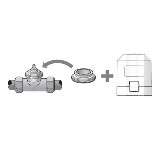 Univerzálny adaptér na pripojenie servopohonu ventilu (napríklad HmIP-VDMOT) a termostatických hlavíc od predných výrobcov nacvaknutím, závit na štandard M30 x 1,5 mm.