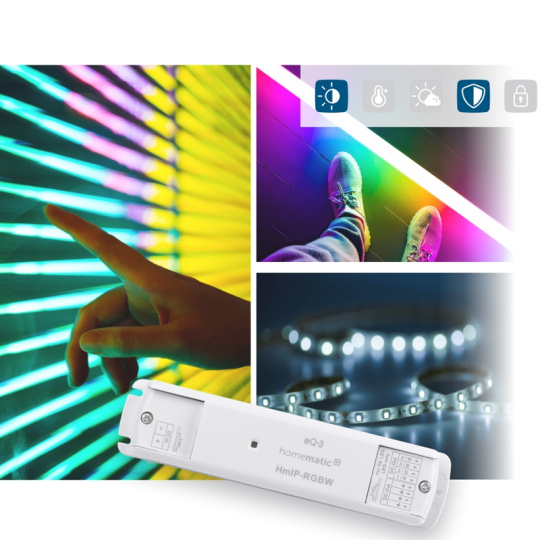 V závislosti od druhu LED pásu umožňuje RGBW LED kontrolér (HmIP-RGBW) vzdialene zapínať/vypínať pripojené svietiace LED okruhy, meniť farbu scény a regulovať intenzitu jasu a farebnú teplotu.