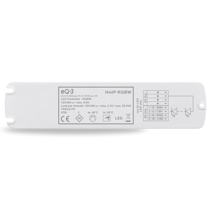 RGBW LED kontrolér (HmIP-RGBW) umožňuje jednoduché ovládanie LED osvetlenia v podobe nezávislého riadenia až 4 kanálov pre pripojenie moderných monochromatických aj farebných LED pásov. Kontrolér ponúka možnosť pripojenia jedného RGB(W) pásu, dvoch regulovateľných bielych pásov (CCT W) alebo až štyroch jednoduchých LED pásov (W).
