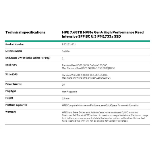 HPE 7.68TB NVMe Gen4 High Performance Read Intensive SFF BC U.3 PM1733a SSD P50222-B21 RENEW.