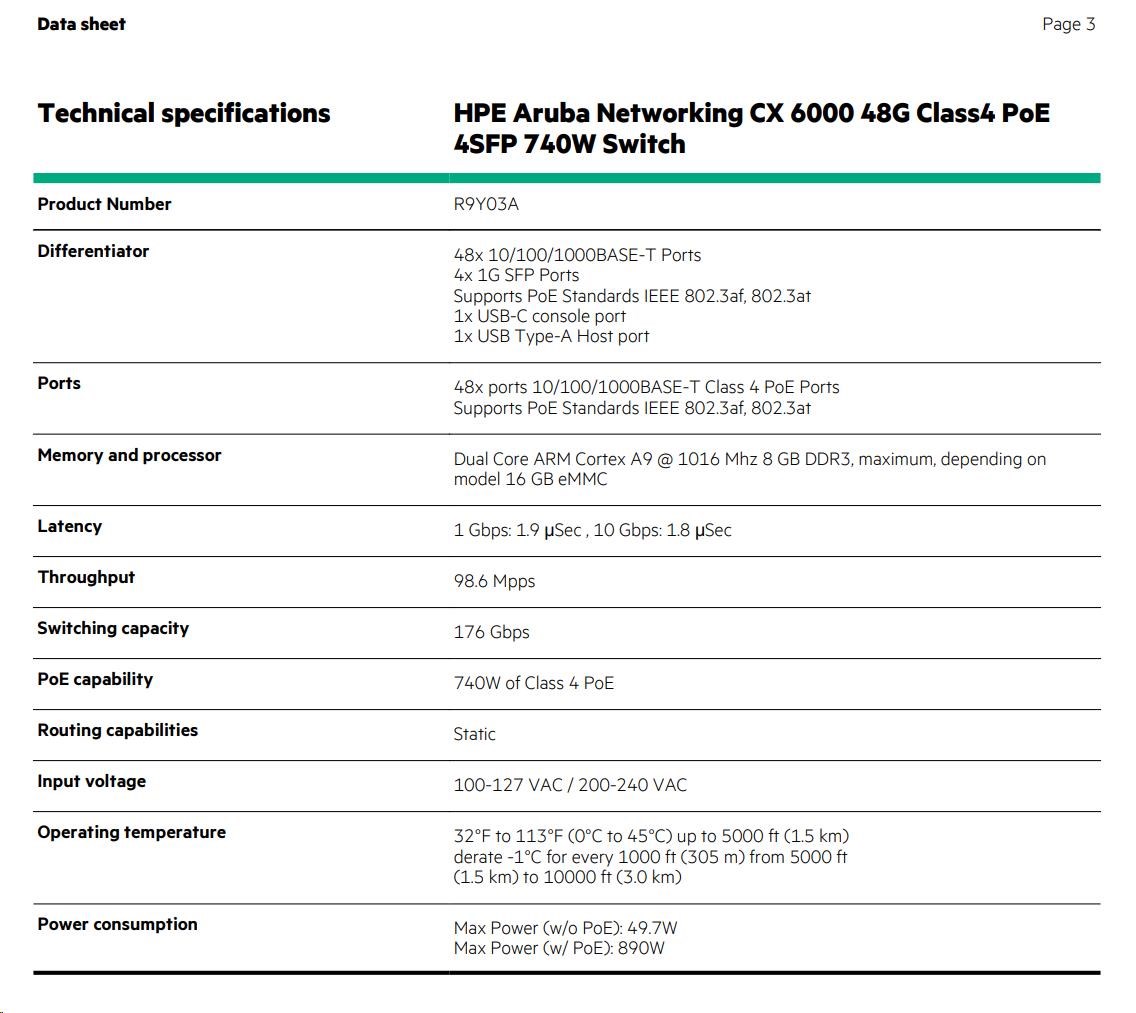 HPE Aruba Networking CX 6000 48G Class4 PoE 4SFP 740W Switch.