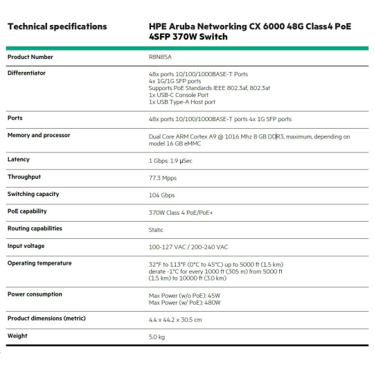 HPE Aruba CX 6000 48G PoE Switch - Specifications