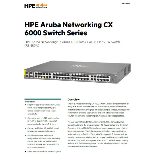 HPE Aruba Networking CX 6000 48G Class4 PoE 4SFP 370W Switch.
