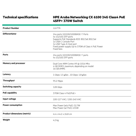 | Specifications | Aruba 6100 24G Class4 PoE 4SFP+ 370W Switch (JL677A) |