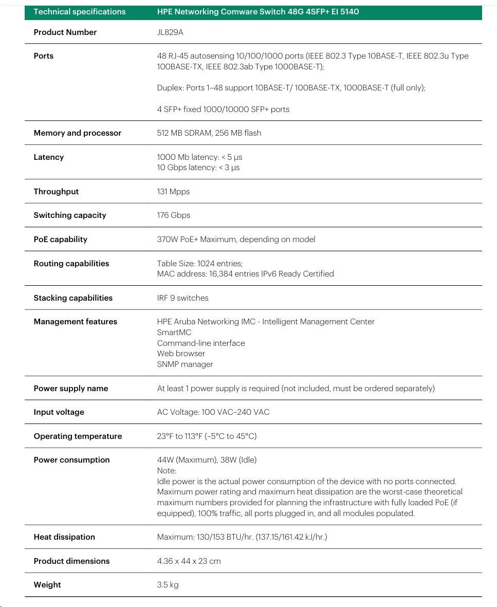 | HPE Networking Comware Switch 48G 4SFP+ EI 5140 | JL829A | |