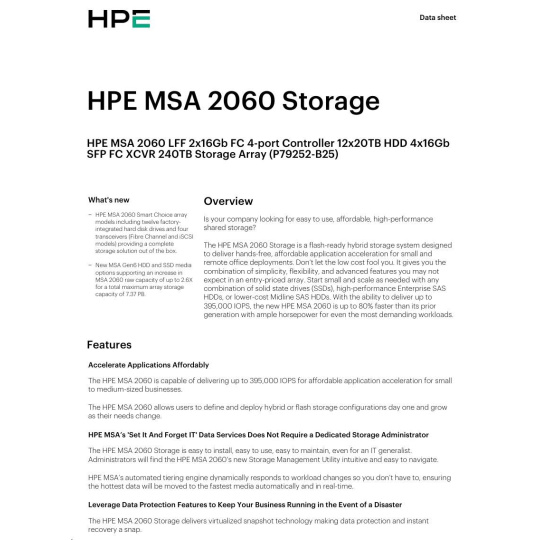 Is your company looking for easy to use, affordable, high-performance shared storage? The HPE MSA 2060 Storage is a flash-ready hybrid storage system designed to deliver hands-free, affordable application acceleration for small and remote office deployments. Don’t let the low cost fool you. It gives you the combination of simplicity, flexibility, and advanced features you may not expect in an entry-priced array. Start small and scale as needed with any combination of solid state drives (SSDs), highperformance Enterprise SAS HDDs, or lower-cost Midline SAS HDDs. With the ability to deliver up to 395,000 IOPS, the new HPE MSA 2060 is up to 80% faster than its prior generation with ample horsepower for even the most demanding workloads.