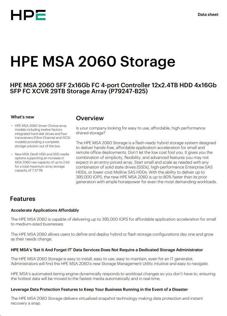 HPE MSA 2060 SFF 2x16Gb FC 4-port Controller 12x2.4TB HDD 4x16Gb SFP FC XCVR 29TB Storage Array.