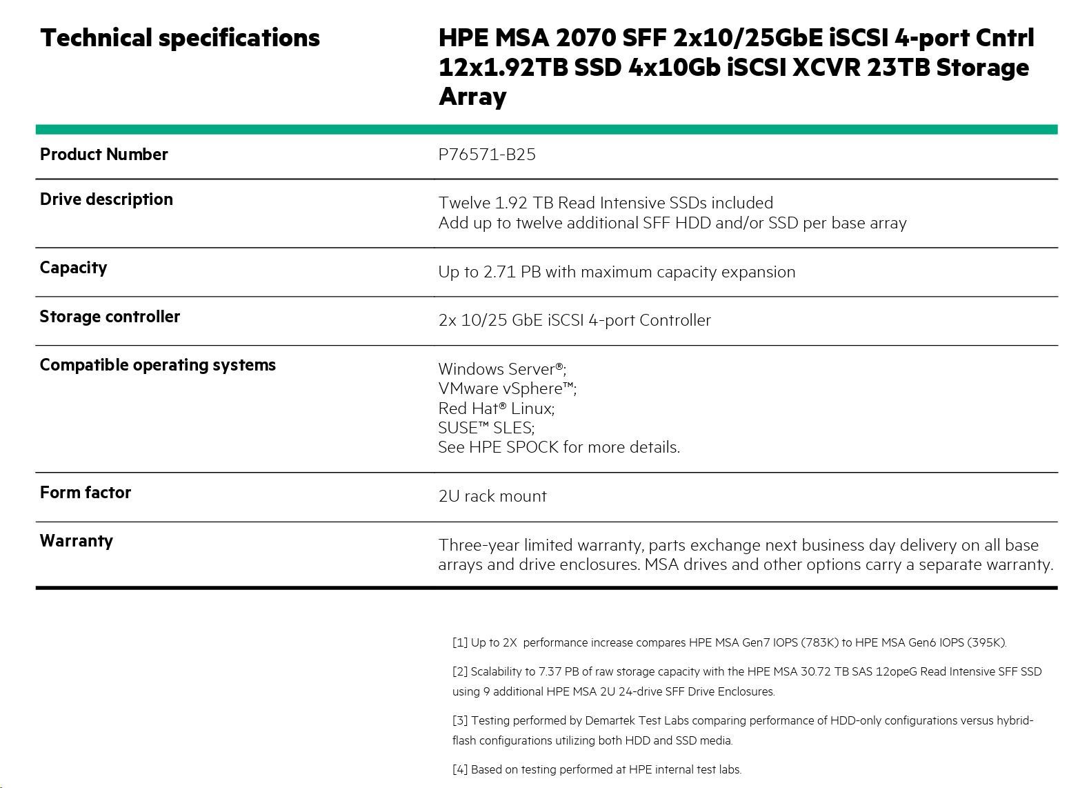 HPE MSA 2070 SFF 2x10/25GbE iSCSI 4-port Cntrl 12x1.92TB SSD 4x10Gb iSCSI XCVR 23TB Storage Array.