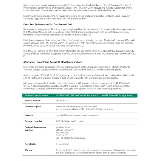 HPE MSA 2070 SFF 2x12Gb SAS 4-port Controller 12x3.84TB SSD 46TB Storage Array Smart Choice.