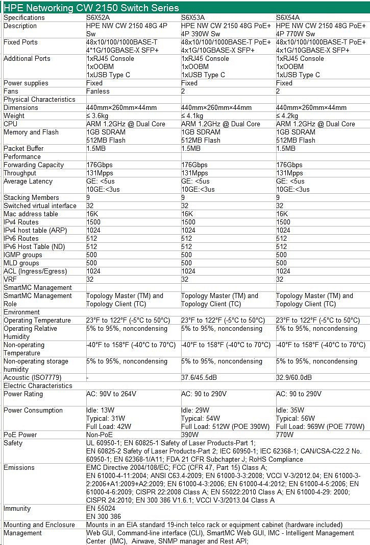 HPE Networking CW 2150 48p 10M/100M/1G PoE+ 4p SFP+ 1G/10G 390W Switch.