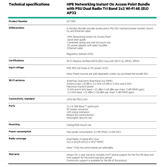 HPE Networking Instant On Access Point Bundle with PSU Dual Radio Tri Band 2x2 Wi-Fi 6E (EU) AP32 ( S1T28A )