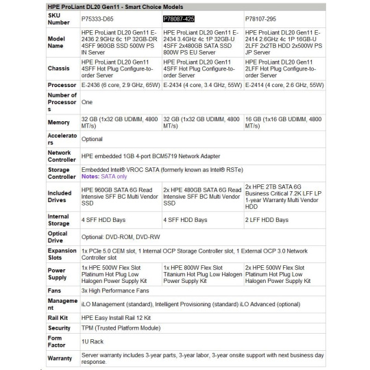 HPE PL DL20g11 E-2434 (3.4G/4C) 1x32G (P64339) 2x480G VROC 4SFF 1x800W 4x1G NBD333 Smart Choice