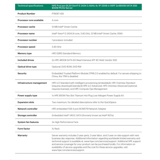 HPE PL DL20g11 E-2434 (3.4G/4C) 1x32G (P64339) 2x480G VROC 4SFF 1x800W 4x1G NBD333 Smart Choice.