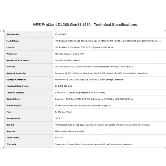 | Model Name | HPE ProLiant DL360 Gen11 4510 2.4GHz 12c 1P 64GB-R 8SFF MR408i-o 2x960GB SSD 2x1000W PS EMEA Server |