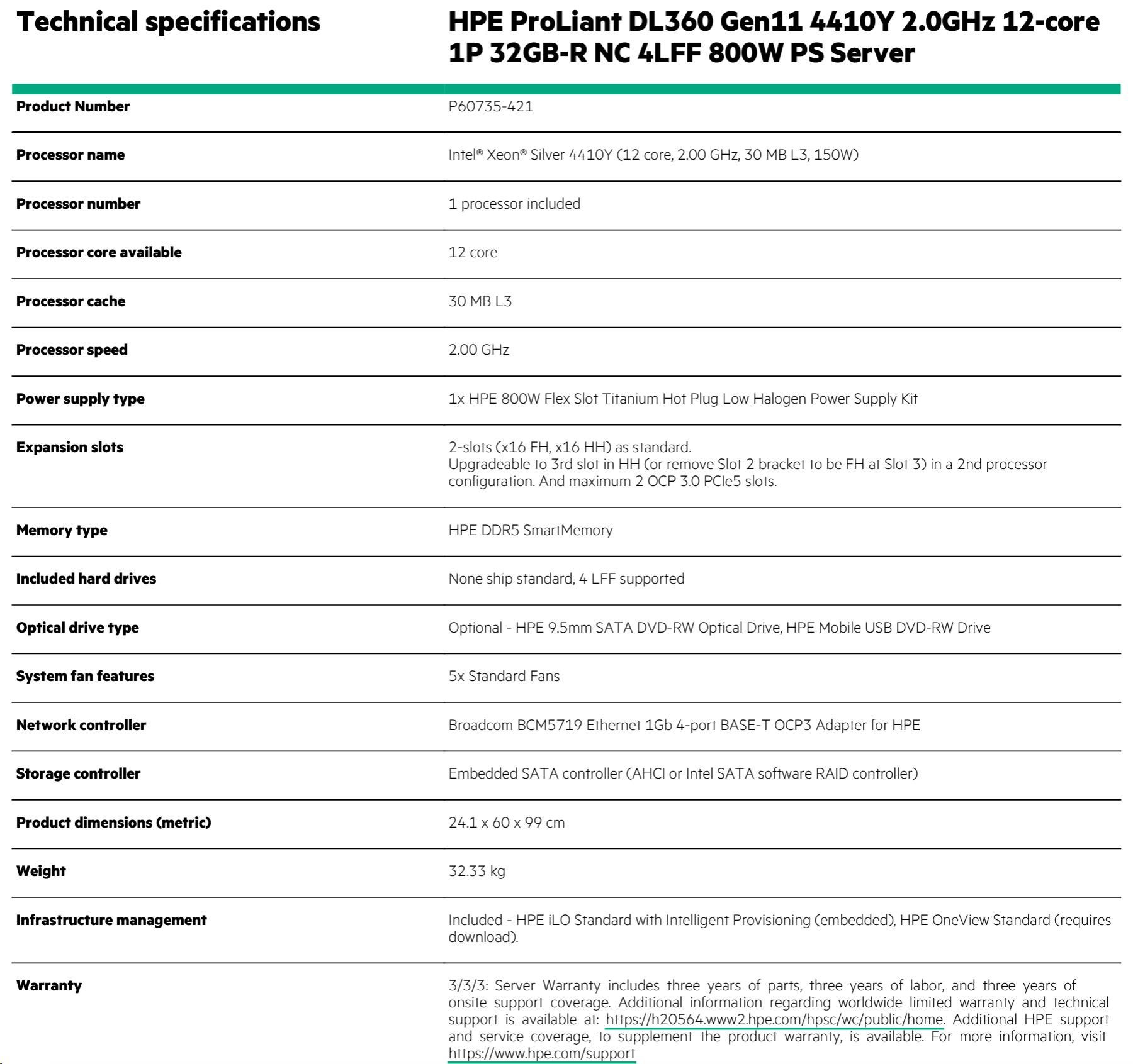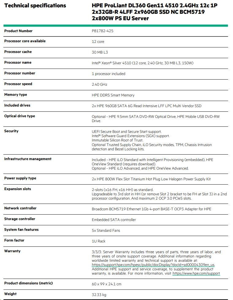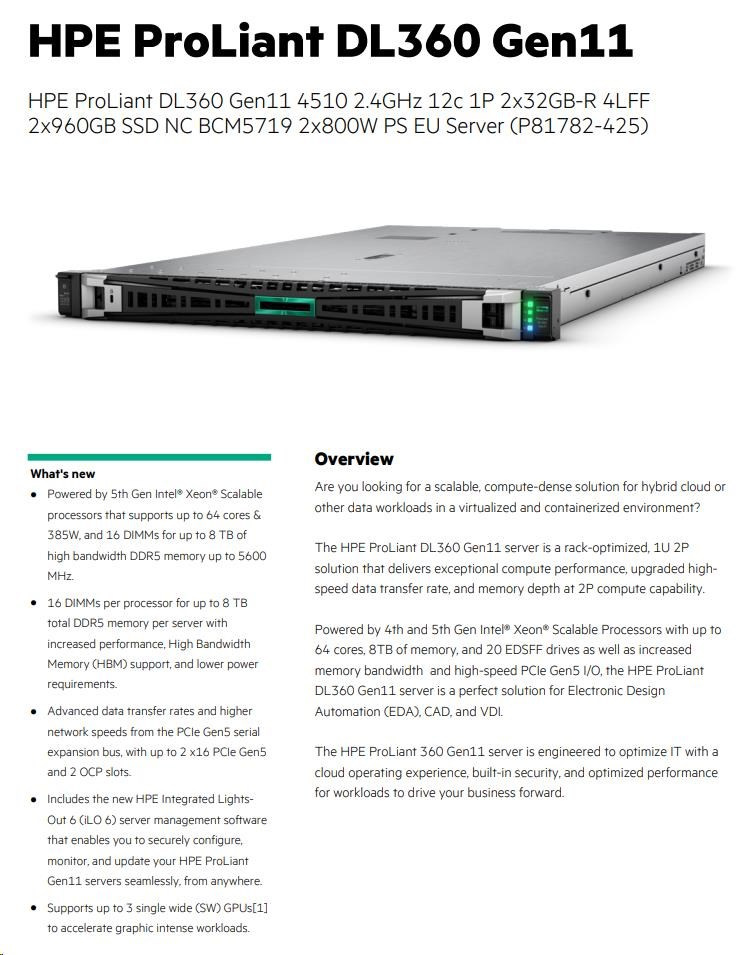 HPE PL DL360g11 4510 (2.4G/12C) 2x32G 2x960G VROC 4LFF LPC 2x800W 4x1G Smart Choice.