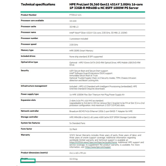 | Model Name | HPE ProLiant DL360 Gen11 4514Y 2.0GHz 16-core 1P 32GB-R MR408i-o NC 8SFF 1000W PS Server |
