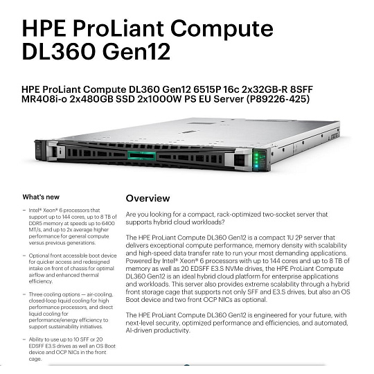 HPE PL DL360g12 6515P (2.4/16C) 4x32G (P69727) NS204i-uv2 MR408i-o 8SFF 2x1000W NBD333 Smart Choice.