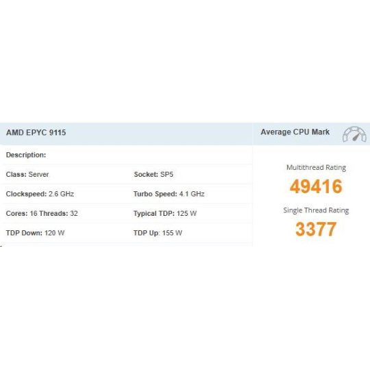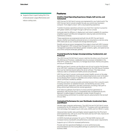 Processor core available 16 core Processor cache 64 MB L3 Processor name AMD EPYC™ 9115 (16 core, 2.60 GHz, 64 MB L3, 125W) Processor number 1 processor included Processor speed 2.60 GHz Memory type HPE DDR5 Smart Memory Included drives 2x HPE 480GB SATA 6G Read Intensive SFF BC Multi Vendor SSD Optical drive type Optional: 9.5mm SATA DVD-ROM/RW Optical Drive Infrastructure management HPE iLO Standard with Intelligent Provisioning (embedded), HPE OneView Standard (requires download), HPE iLO Advanced, HPE iLO Advanced Premium Security Edition, HPE OneView Advanced (require license), and HPE Compute Ops Management Power supply type 2x HPE 1000W Flex Slot Titanium Hot Plug Power Supply Kit Expansion slots 2 maximum, for detail descriptions refer to the QuickSpecs Network controller Broadcom BCM57416 Ethernet 10Gb 2-port BASE-T OCP3 Adapter for HPE Storage controller HPE MR408i-o Gen11 x8 Lanes 4GB Cache OCP SPDM Storage Controller System fan features 7x Standard Fans Form factor 1U Rack Warranty 3/3/3: Server Warranty includes three years of parts, three years of labor, and three years of on-site support coverage. Additional information regarding worldwide limited warranty and technical support is available at: https://support.hpe.com/hpsc/wc/public/home. Additional HPE support and service coverage for your product can be purchased locally. For information on availability of service upgrades and the cost for these service upgrades, refer to the HPE website at https://www.hpe.com/support. Product dimensions (metric) Weight 91.6 x 60 x 24.2 cm 29.36 kg