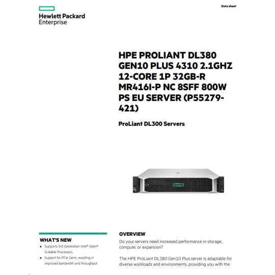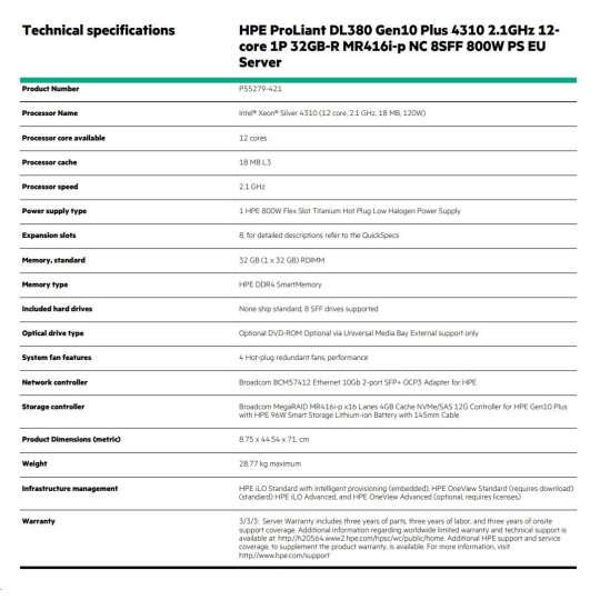 | Model Name | HPE ProLiant DL380 Gen10 Plus 4310 2.1GHz 12-core 1P 32GB-R MR416i-p NC 8SFF 800W PS EU Server |