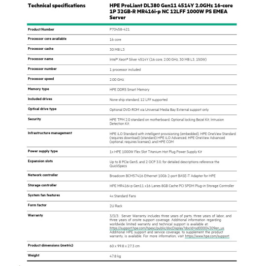 Model Name HPE PL DL380g11 4514Y (2.0/16C/30M) 32G MR408i-o/4G 12LFF 1000Wti 2x10G-T