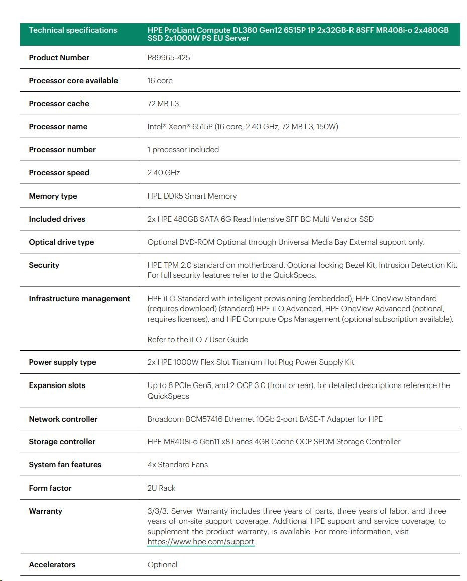HPE PL DL380g12 6515P (2.2/16C) 2x32G (P69727) 2x480G MR408i-o 8SFF 2x1000W 2p10G-T NBD333 Smart Choice