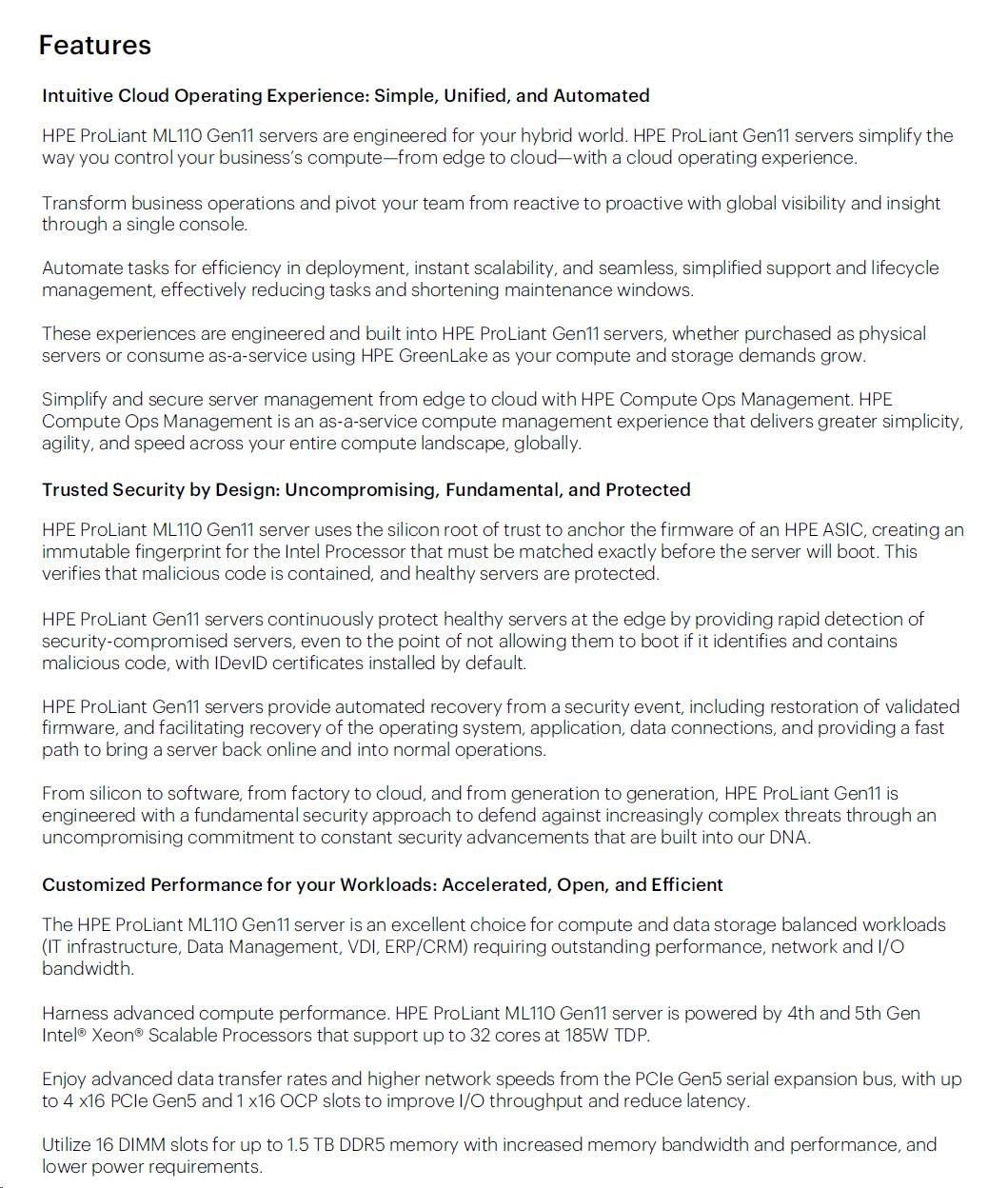 | Management | HPE iLO Standard with Intelligent Provisioning (embedded), HPE OneView Standard (requires download); HPE iLO Advanced and HPE OneView Advanced (require licenses) |