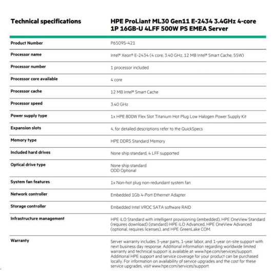 | SKU Number | P65095-421: HPE ProLiant ML30 Gen11 E-2434 3.4GHz 4-core 1P 16GB-U 4LFF 500W PS EMEA Server |