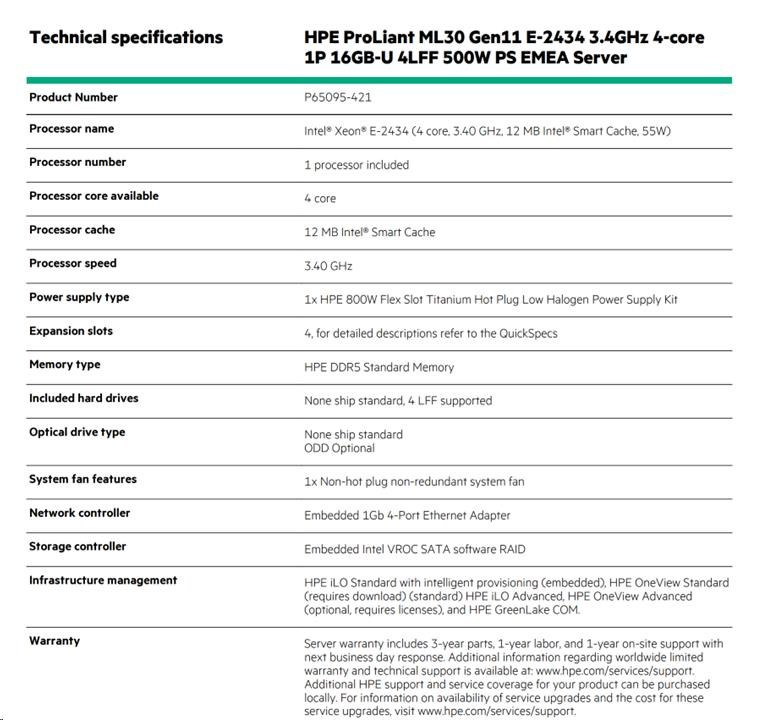 | SKU Number | P65095-421: HPE ProLiant ML30 Gen11 E-2434 3.4GHz 4-core 1P 16GB-U 4LFF 500W PS EMEA Server |