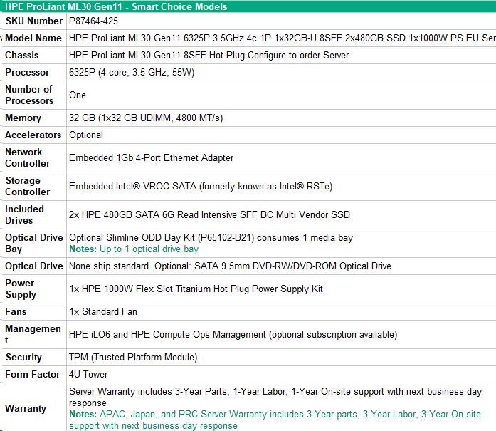 HPE PL ML30g11 6325P (3.5G/4C8T) 1x32G 2x480G SSD 8SFF VROC 1x1000W 4p1G NBD311 Smart Choice