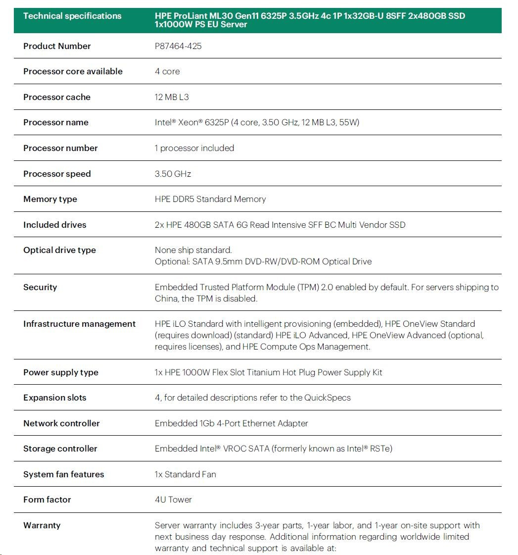 HPE PL ML30g11 6325P (3.5G/4C8T) 1x32G 2x480G SSD 8SFF VROC 1x1000W 4p1G NBD311 Smart Choice.