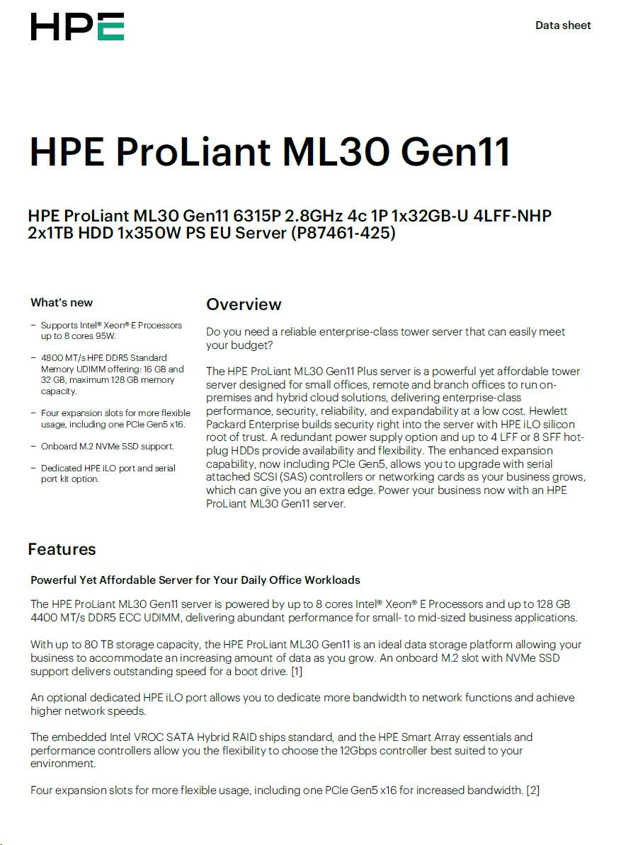 HPE PL ML30g11 6325P (3.5G/4C8T) 1x32G 2x960G SSD SATA 4LFF-HP VROC 1x1000W 4p1G NBD311 Smart Choice