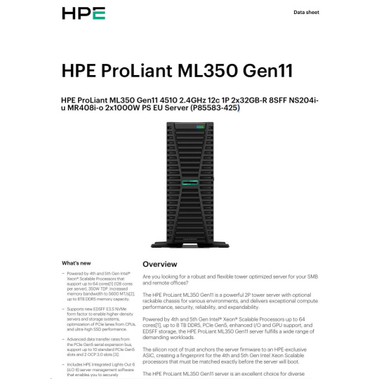 HPE PL ML350g11 4510 (2.4G/12C) 2x32G (P64706) NS204(2x480) MR408i-o 2x1000W 8SFF 4p1Gb Smart Choice.