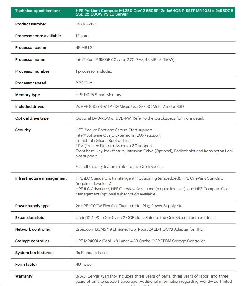 HPE PL ML350g12 6505P (2.2/12C) 1x32G (P69728) 2x4TB 4LFF MR408i-o2x1000W 1GbE NBD333 Smart Choice.