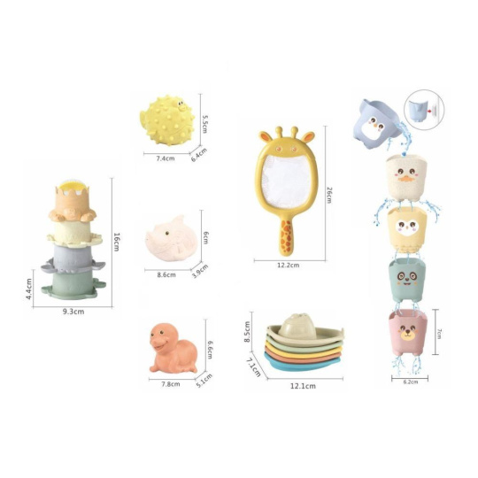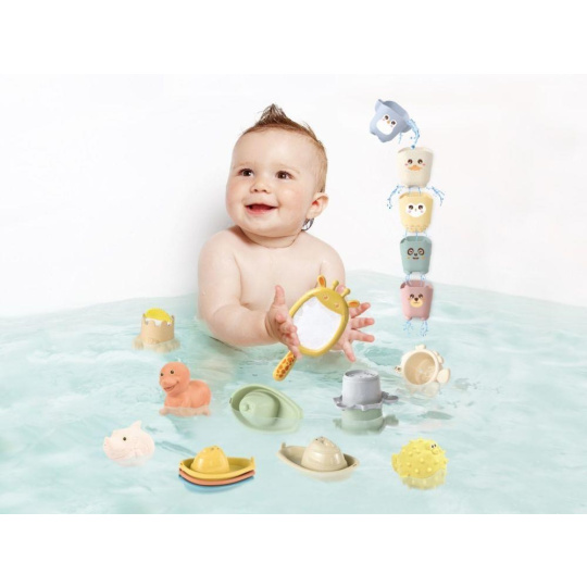Sada roztomilých hračka do vody 5v1, so zvieratkami zo ZOO, premení každé kúpanie na zábavnú hru. Lodíčky, zvieratá, kelímky a sieťka sa postarajú o to, že kúpanie vo vaničke, vanej alebo v bazéniku nebude nuda. Na naberanie vody, prelievanie a polievanie poslúžia stohovacie kelímky alebo kelímky so zvieratkami, na vlnách sa vlnia farebné lodíčky a zvieratá a na rybára si deti zahrajú so sieťkou žirafa.