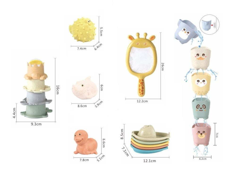 Sada roztomilých hračka do vody 5v1, so zvieratkami zo ZOO, premení každé kúpanie na zábavnú hru. Lodíčky, zvieratá, kelímky a sieťka sa postarajú o to, že kúpanie vo vaničke, vanej alebo v bazéniku nebude nuda. Na naberanie vody, prelievanie a polievanie poslúžia stohovacie kelímky alebo kelímky so zvieratkami, na vlnách sa vlnia farebné lodíčky a zvieratá a na rybára si deti zahrajú so sieťkou žirafa.