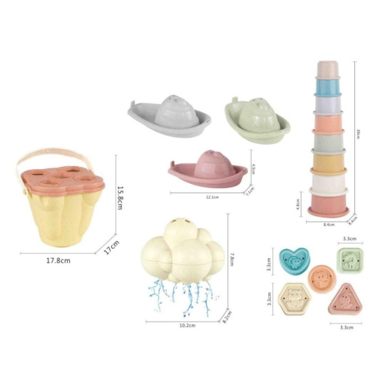 Sada hračiek do vody 5v1 v praktickom kyblíku premení každé kúpeľ na zábavnú hru. Loďky, kelímky a obláčik, uložené v kyblíku, ktorý je zároveň aj vkladačkou, sa postarajú o to, že kúpanie ve vaničke, vane alebo v bazéniku nebude nuda. K naberaniu vody, prelievaniu a polievaniu poslúžia stohovacie kelímky s číslami alebo kyblík, na vlnách sa pohupujú farebné loďky a z obláčika zaprší vždy, keď sa naplní vodou.