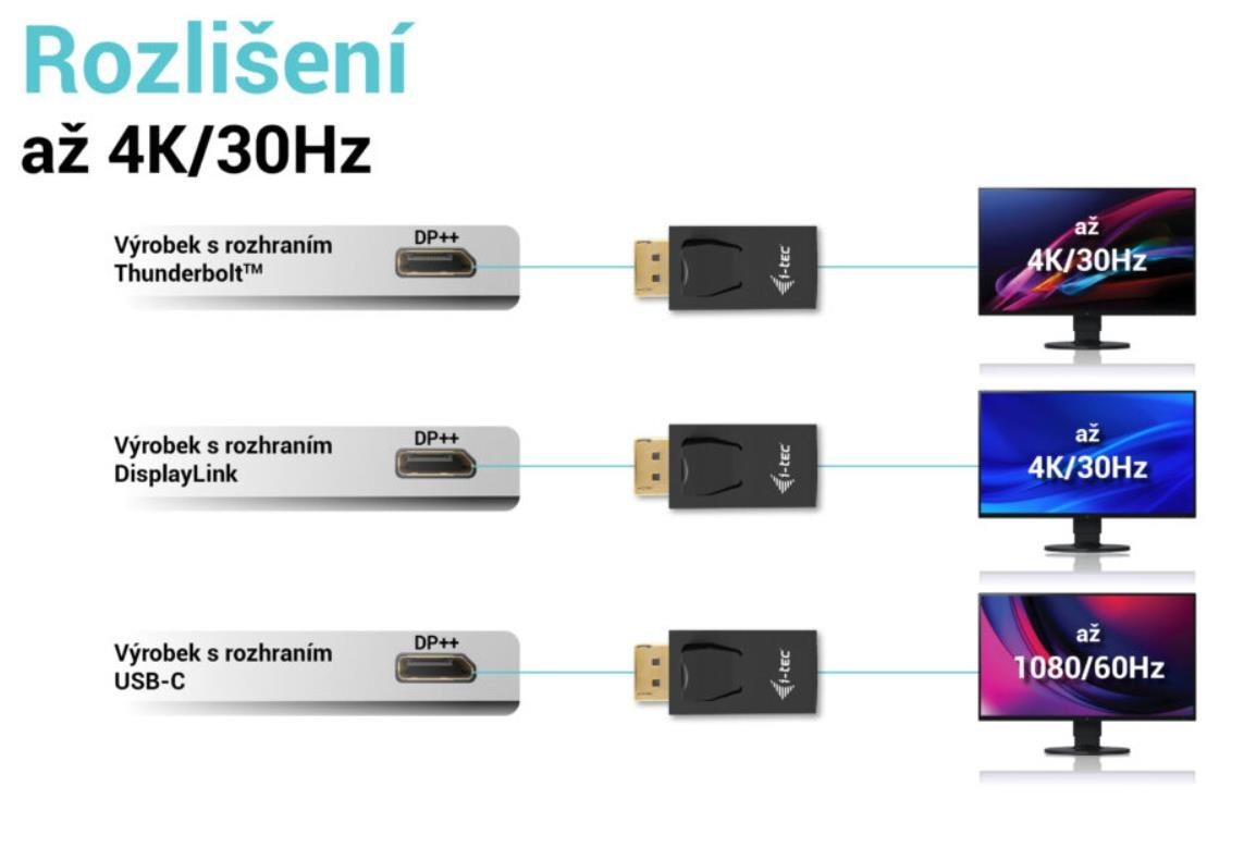 - V prípade DisplayPortu s DisplayLinkom bude maximálne rozlíšenie 4K / 30 Hz (napríklad dokovacie stanice i-tec alebo videoadaptéry s číslom produktu začínajúcim CAxxxxxxxxx).