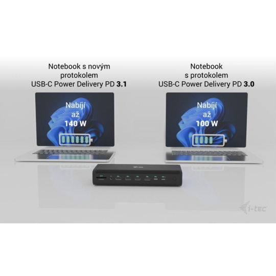 ** Ak váš notebook alebo tablet podporuje nový a moderný nabíjací protokol USB-A Power Delivery PD 3.1, dokovacia stanica ponúkne nabíiaci výkon až 140 W (ak máte PD 3.0, nabíjací výkon bude 100 W).